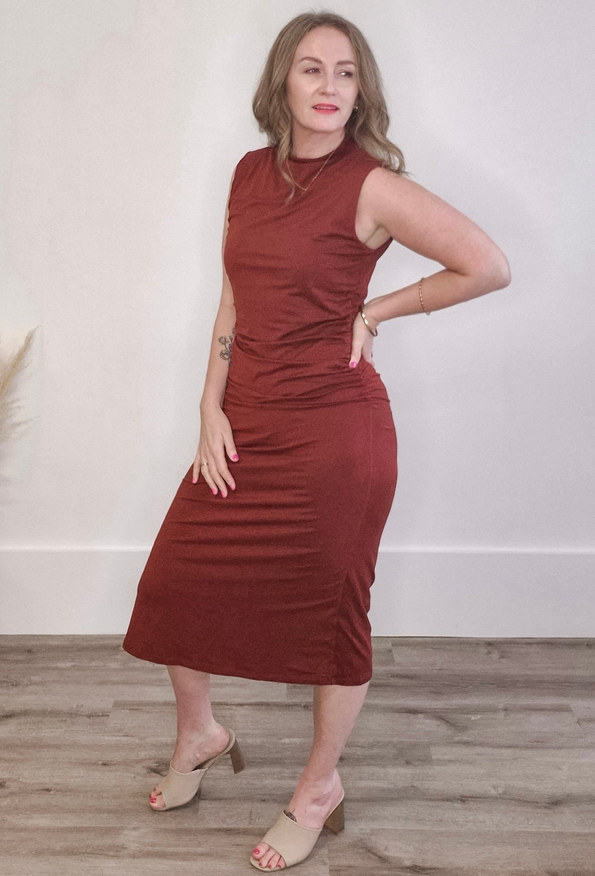 Embrace effortless charm with this midi dress featuring a flirty draped neckline and a chic mock neck. Its sleeveless design and side slits add just the right amount of sass, while the soft fabric keeps you comfy all day long. Perfect for twirling through any occasion with playful ease!