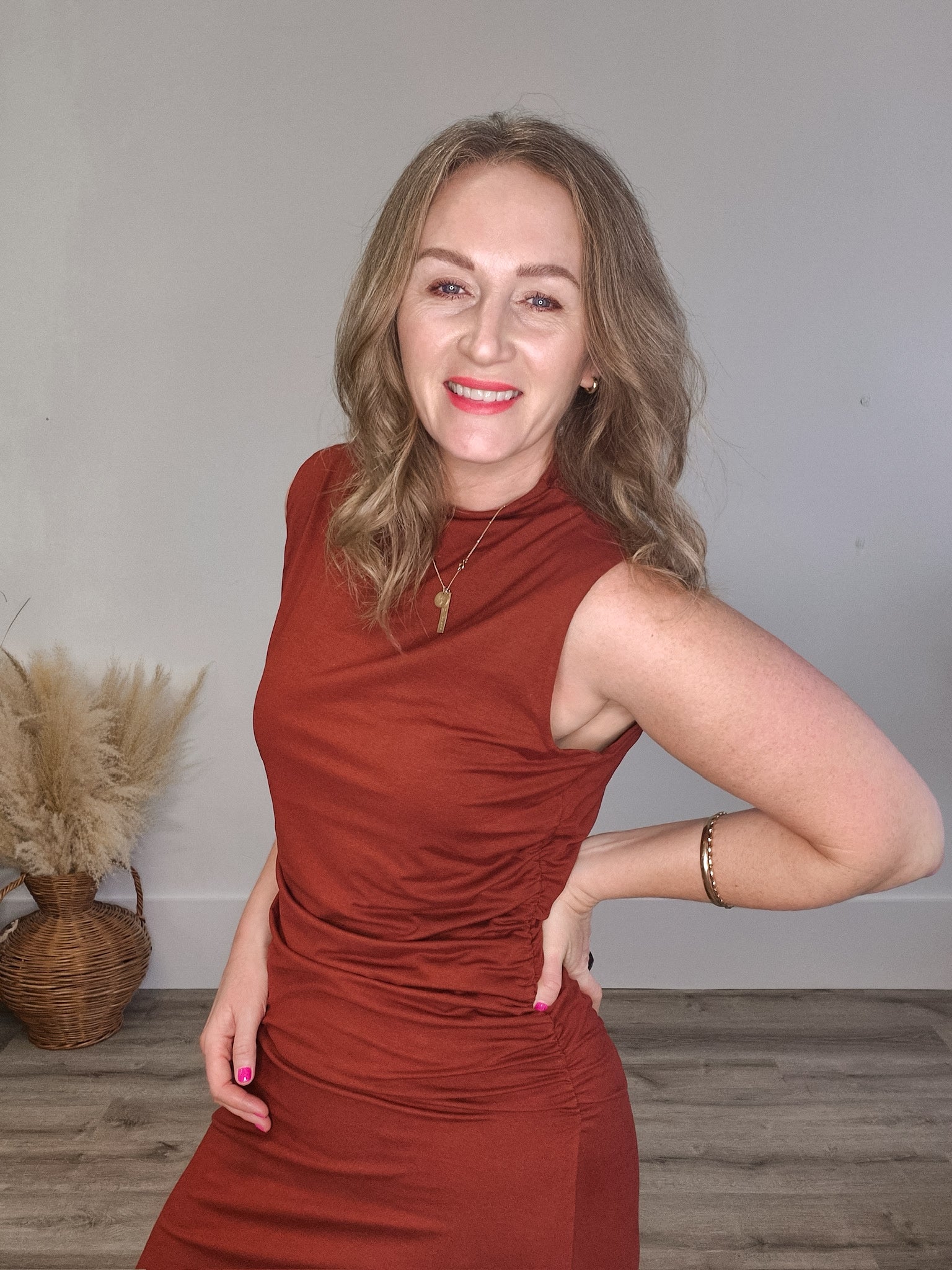 Mel is 5’8” wearing the size small. Model is 5'8" and wearing the small