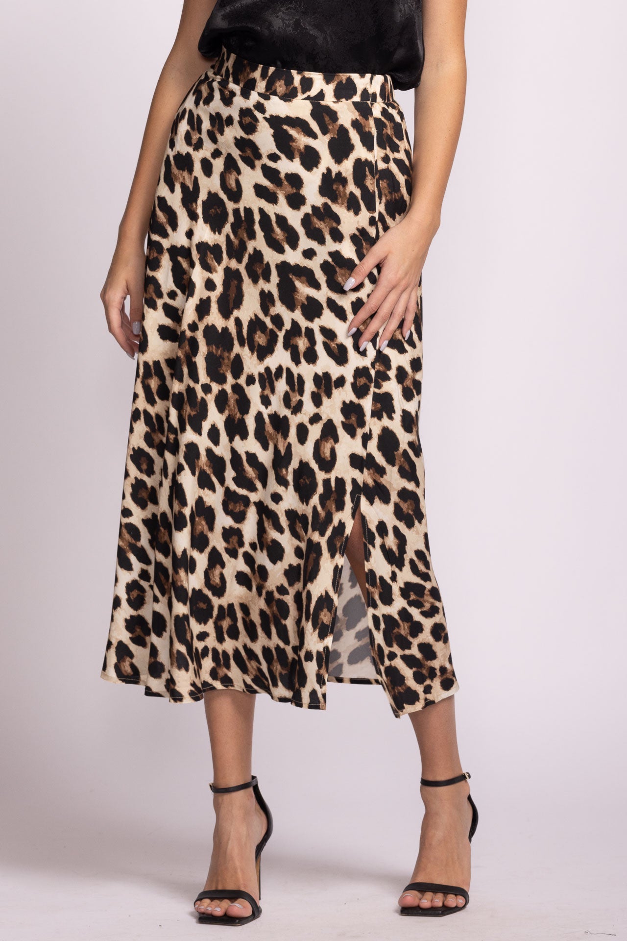 The Fran Skirt by Pink Martini brings effortless style with an all-over leopard print that works with everything in your wardrobe. This midi-length design features a convenient pockets and adjustable back waist elastic for a personalized fit that moves with you. The fabric is cut on the bias for natural flexibility, while strategic side slits add movement and comfort. Whether you're dressing up or keeping it casual, this versatile piece is designed to make you feel confident and comfortable all day long.