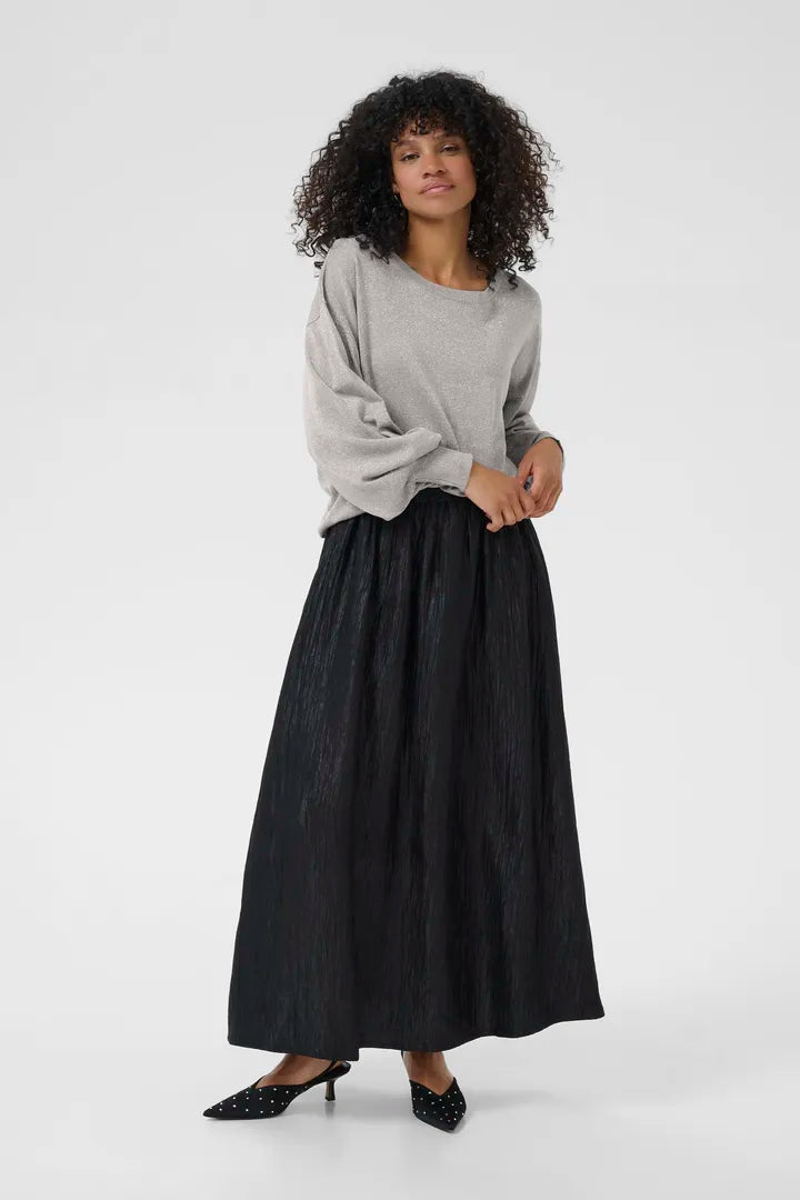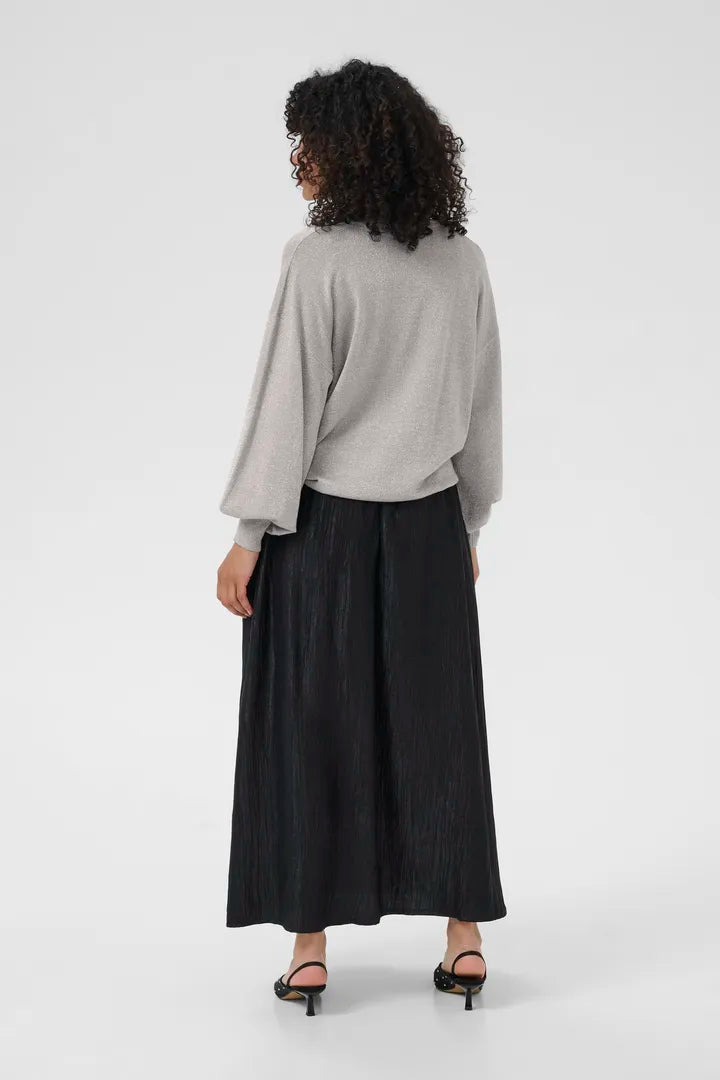 The Regina Knit Pullover combines effortless style with everyday comfort. This lightweight sweater features delicate silver threading woven throughout for a touch of understated elegance. The round neckline and voluminous balloon sleeves create a flattering, relaxed silhouette that moves with you, while the stretch knit fabric ensures a comfortable fit whether you're layering or wearing it solo. Perfect for transitional seasons and casual moments that call for warmth without bulk.