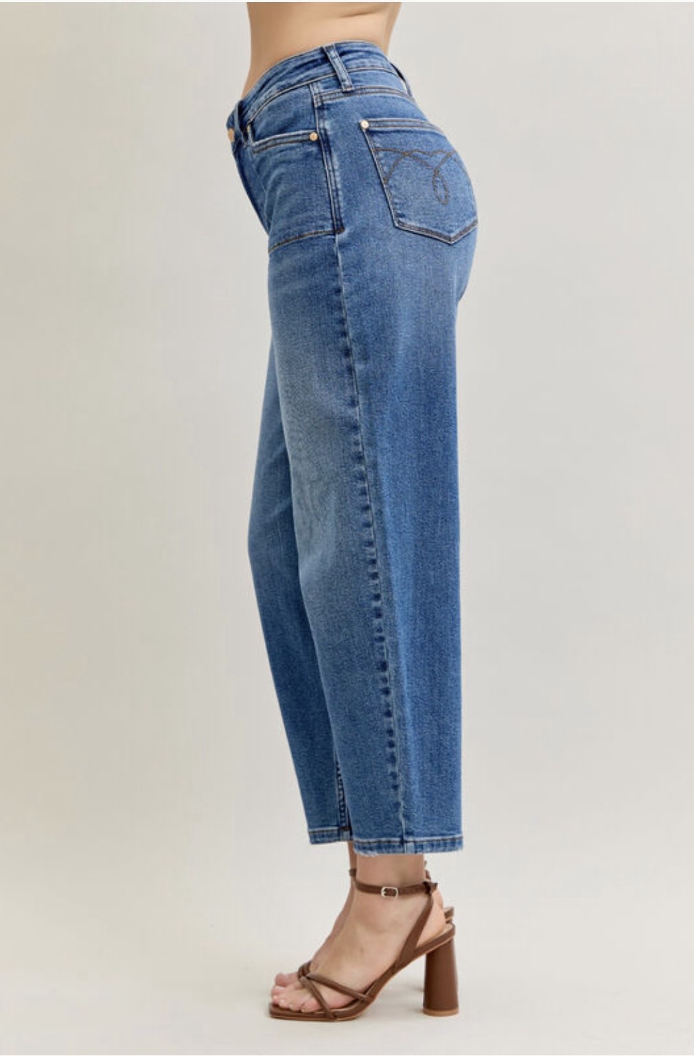 Step up your style game with the Judy Blue Medium Wash Barrel jeans! Featuring a playful high-waisted fit and a trendy barrel-leg silhouette, these cropped ankle-length jeans bring fun to your everyday look. The classic 5-pocket design and medium wash add effortless cool, while the zip and button closure keep things neat and easy. Perfect for mixing and matching with your favorite tops and shoes, these jeans are your new go-to for casual confidence.