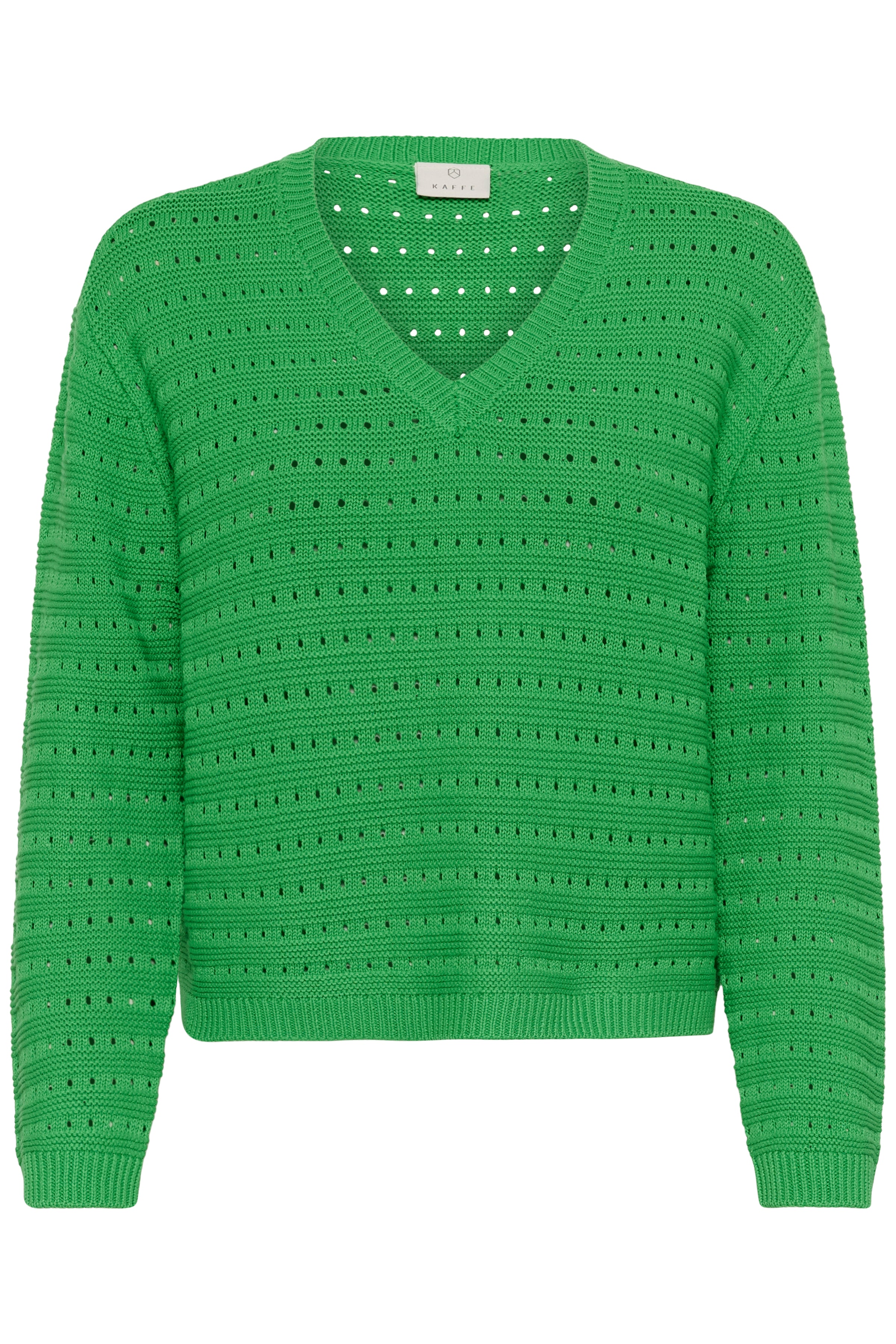 Brighten up your wardrobe with the Kaffe KAnatonia V-Neck Sweater, featuring a bright green hue that radiates positive energy. This lightweight knit showcases a delicate horizontal pointelle pattern, offering a breathable and textured feel that is perfect for versatile layering through the changing seasons. Whether you're running errands or meeting friends for coffee, this sweater provides that "effortless chic" vibe with a soft, comfortable touch for everyday staples.