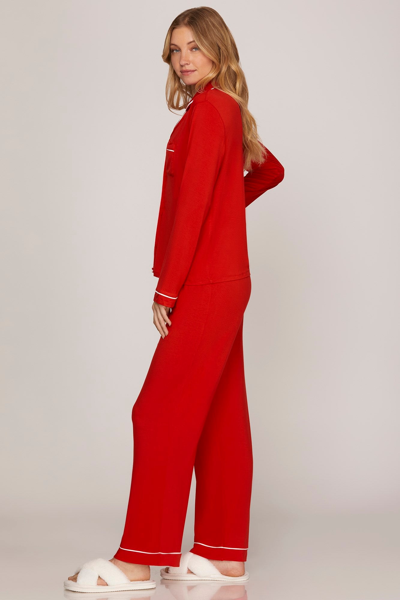 Slip into comfort with these relaxed-fit long sleeve pajamas. The button-down top features a classic collar, white contrast piping for a polished touch, and a convenient front patch pocket. Pair it with the full-length pants that feature an elastic waistband and adjustable self-tie closure for a customized fit. Perfect for a restful night's sleep or cozy lounging at home.