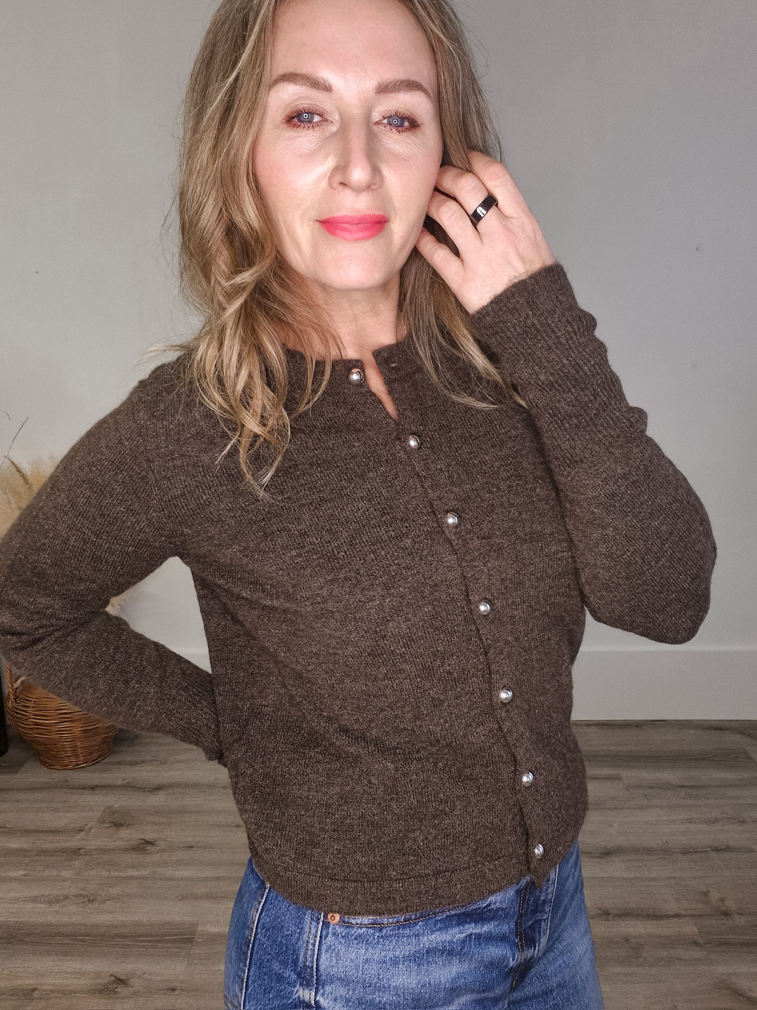 Wrap yourself in cozy charm with the button up cardigan. Crafted from soft fabric, this button-up piece features shiny silver buttons that add a touch of sparkle to your everyday look. With its long sleeves, it’s perfect for snuggling up or layering up in style.