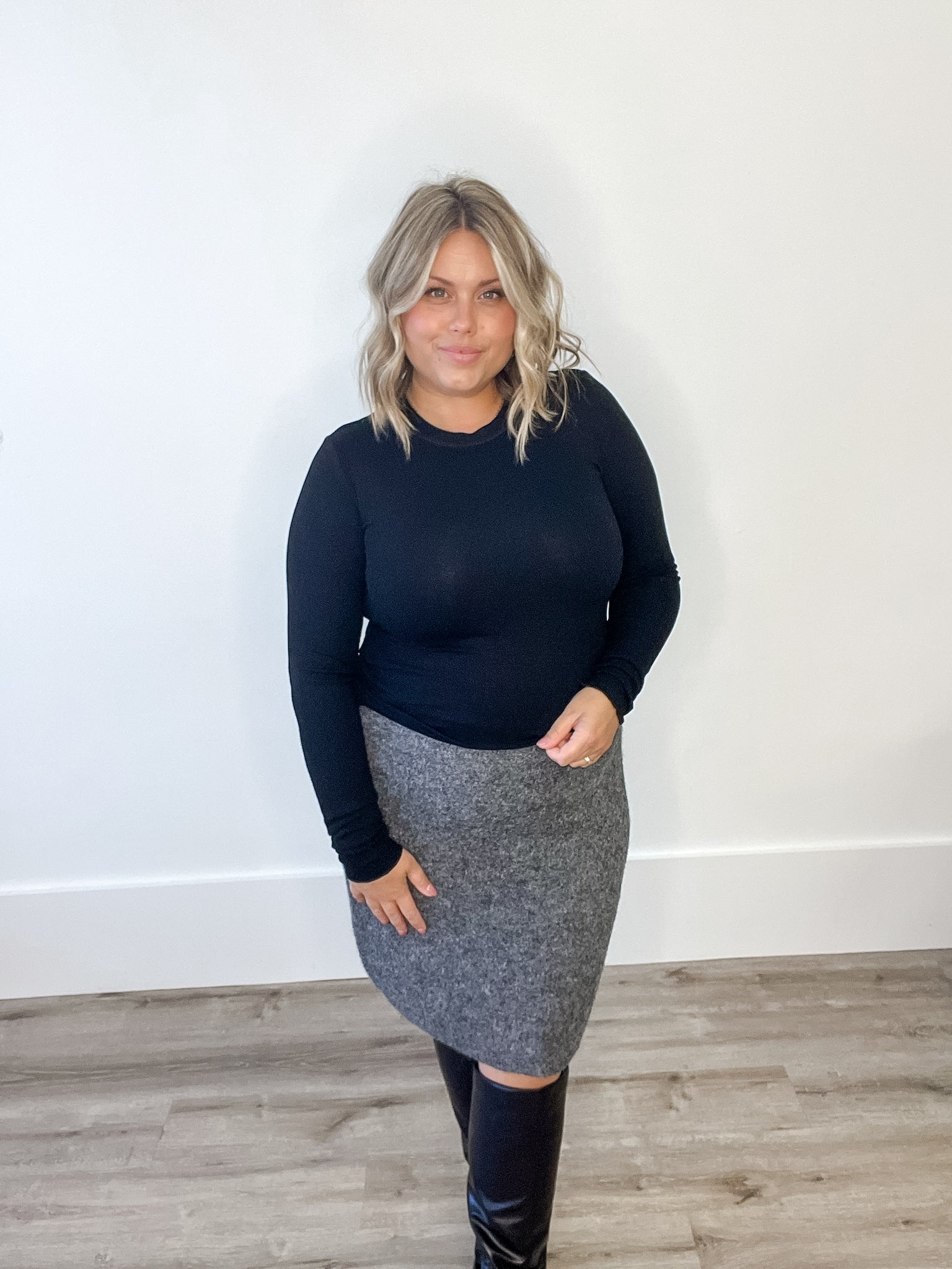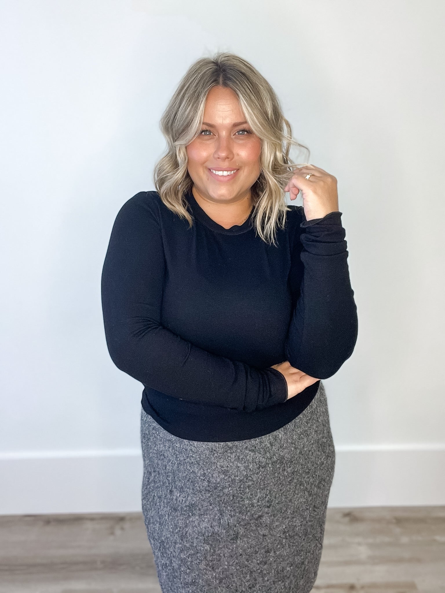 This black ribbed long sleeve top offers a comfortable, stretchy fit with its medium-length design and round neckline. Its soft, ribbed fabric moves with you, making it ideal for everyday wear while providing gentle support through cooler days. A versatile staple that combines style and ease.