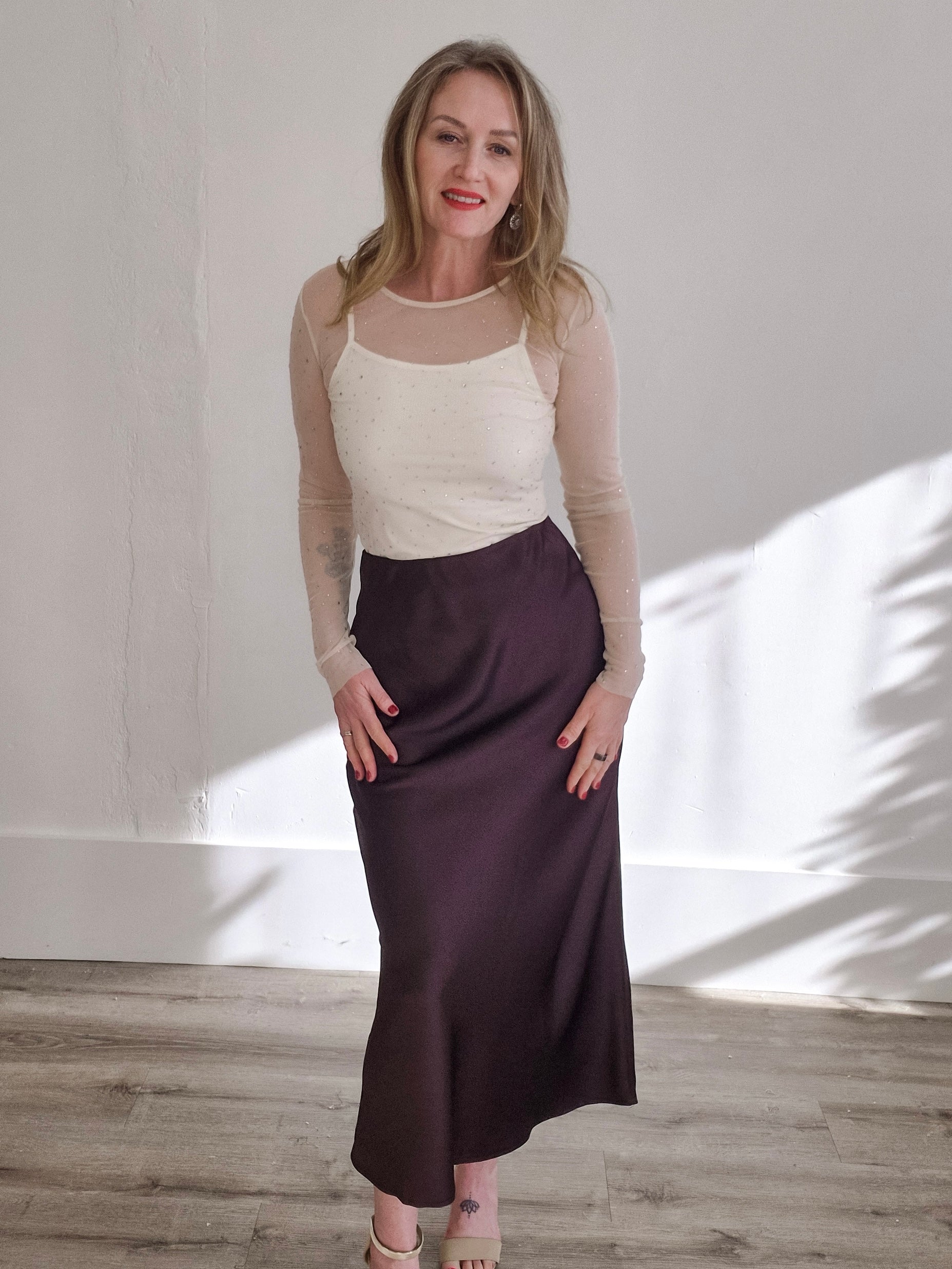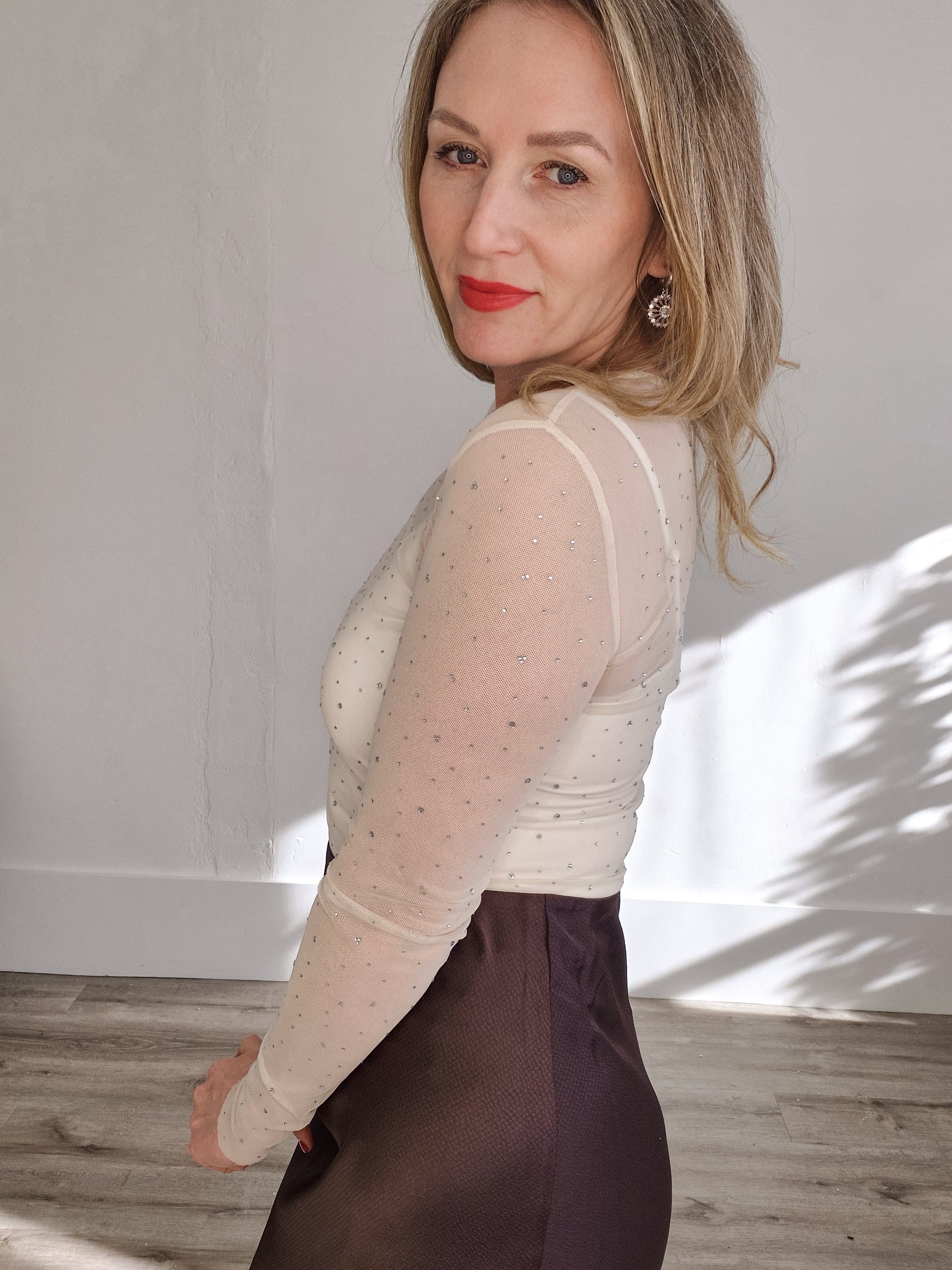 Elevate your evening look with the Stinna Long Sleeve in Black. This sophisticated top features a classic round neckline paired with sheer long sleeves adorned with all-over rhinestone details that catch the light beautifully. The delicate sheer overlay adds dimension and elegance, making it perfect for special occasions or when you want to feel polished and put-together. A versatile piece that transitions seamlessly from dinner to celebration.