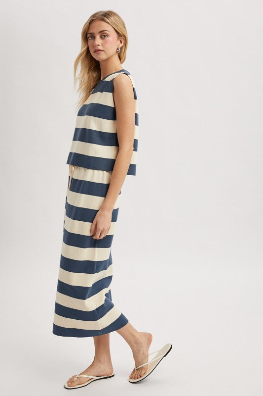 Effortless style meets comfort in this charming two-piece set. The boxy tank top features an all-over striped pattern with a classic round neckline, while the high-waisted midi skirt offers a flattering silhouette with a drawstring and elastic waistband for an adjustable fit. Perfect for casual outings or relaxed weekend wear, this navy set brings together timeless stripes and modern proportions for a look that feels both put-together and wonderfully easy to wear.