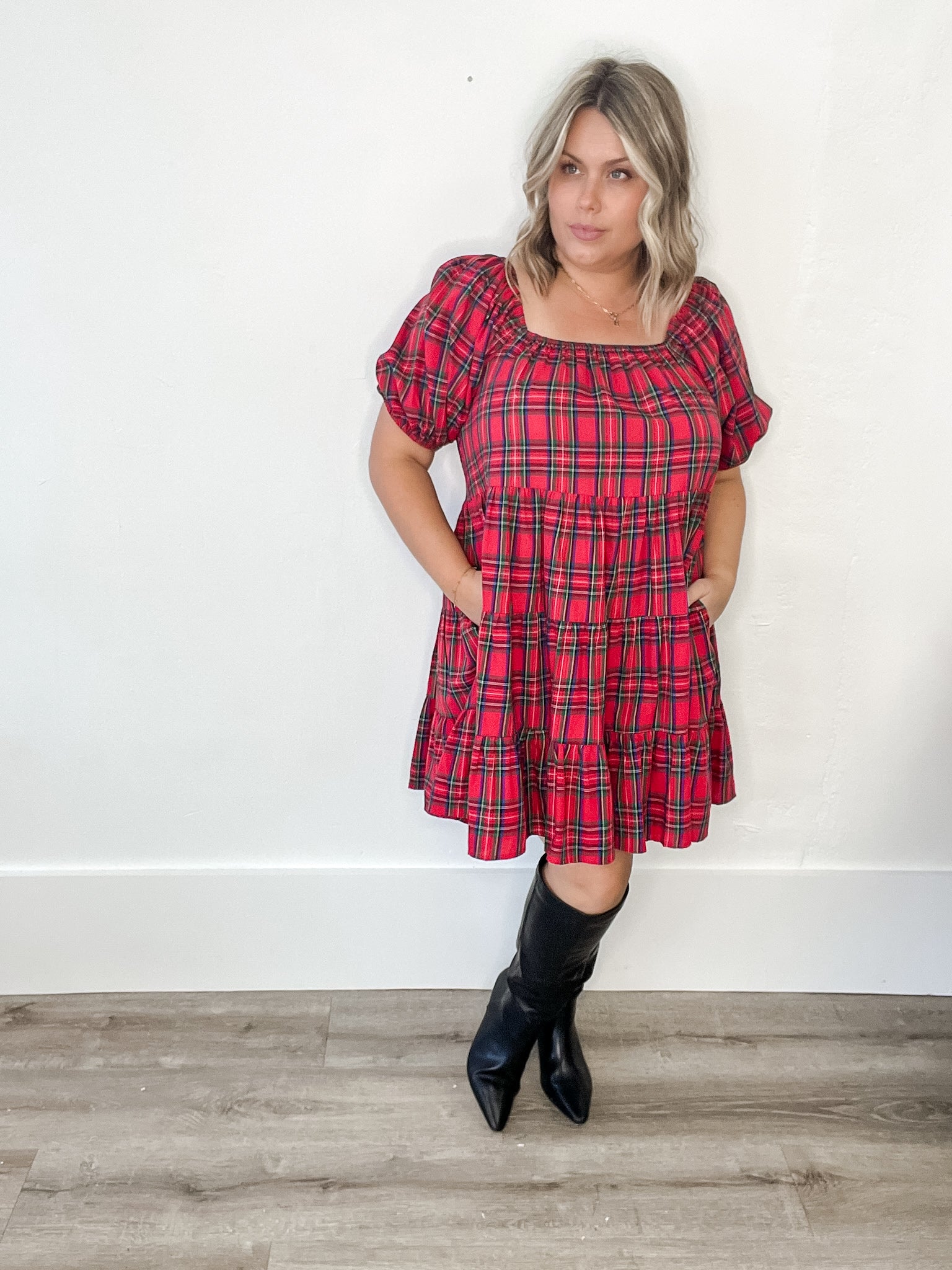Embrace festive charm in this Holiday Dress, featuring an all-over plaid print that captures timeless seasonal style. The square neckline and bubble half sleeves create a flattering, playful silhouette, while the tiered skirt adds movement and dimension. Cut in a comfortable babydoll fit, this dress celebrates your natural shape with ease and confidence. Perfect for holiday gatherings, family photos, or any occasion calling for cheerful elegance.
